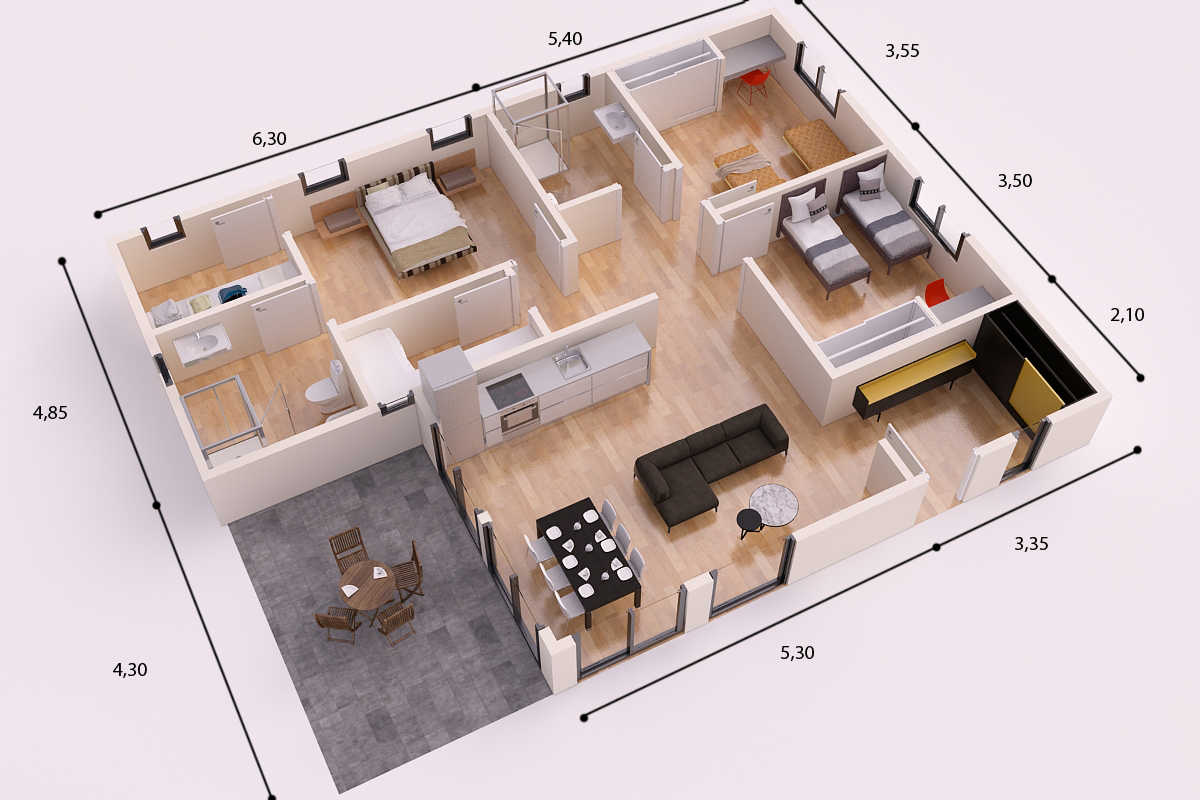 Precio Casa terminada INCLUYE - Proyecto de ejecución y dirección de obra. - Estructura de la casa: muros de carga, divisorias y tejado. - Transporte en tráiler hasta parcela. - Montaje completo con tejado de cerchas de madera. - Cime...